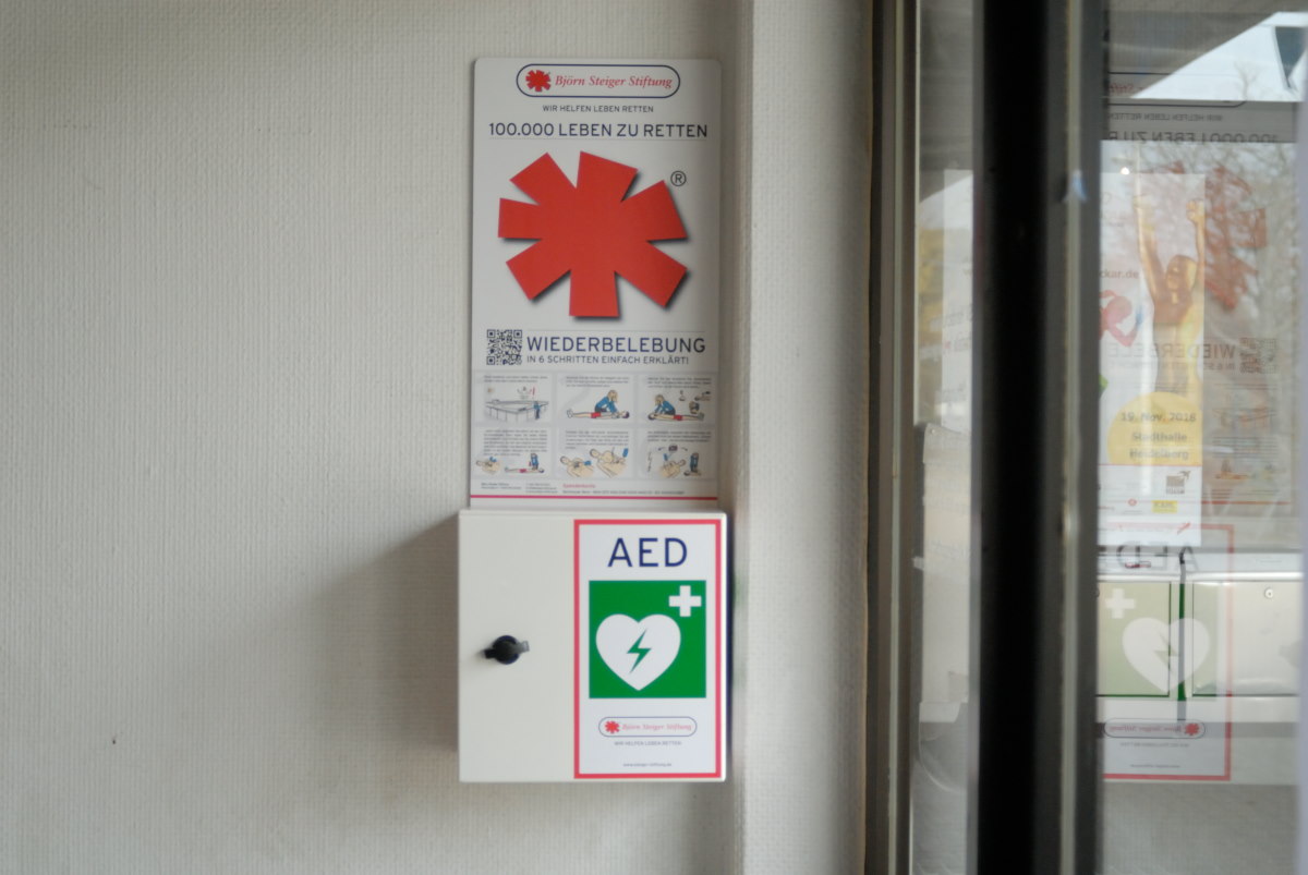 Erste Hilfe rettet Leben. Bei einem Herzstillstand zählt jede Sekunde, denn ohne Wiederbelebungsmaßnahmen sinkt die Überlebenschance jede Minute um zehn Prozent. Um schnelle und wirkungsvolle Hilfe leisten zu können noch bevor Notarzt oder Sanitäter vor Ort sind, hat die Stadt Heidelberg gemeinsam mit der Björn Steiger Stiftung die Aktion „Herzsicheres Heidelberg“ ins Leben gerufen. In diesem Rahmen bringen Stadt und Stiftung in stark frequentierten städtischen Gebäuden sowie in anderen Gebäuden im gesamten Stadtgebiet nach und nach immer mehr sogenannte Laien-Defibrillatoren – Automatisierte Externe Defibrillatoren (AED) – an. Damit können auch medizinische Laien den Betroffenen schnell und effektiv bei einem Herzstillstand helfen.