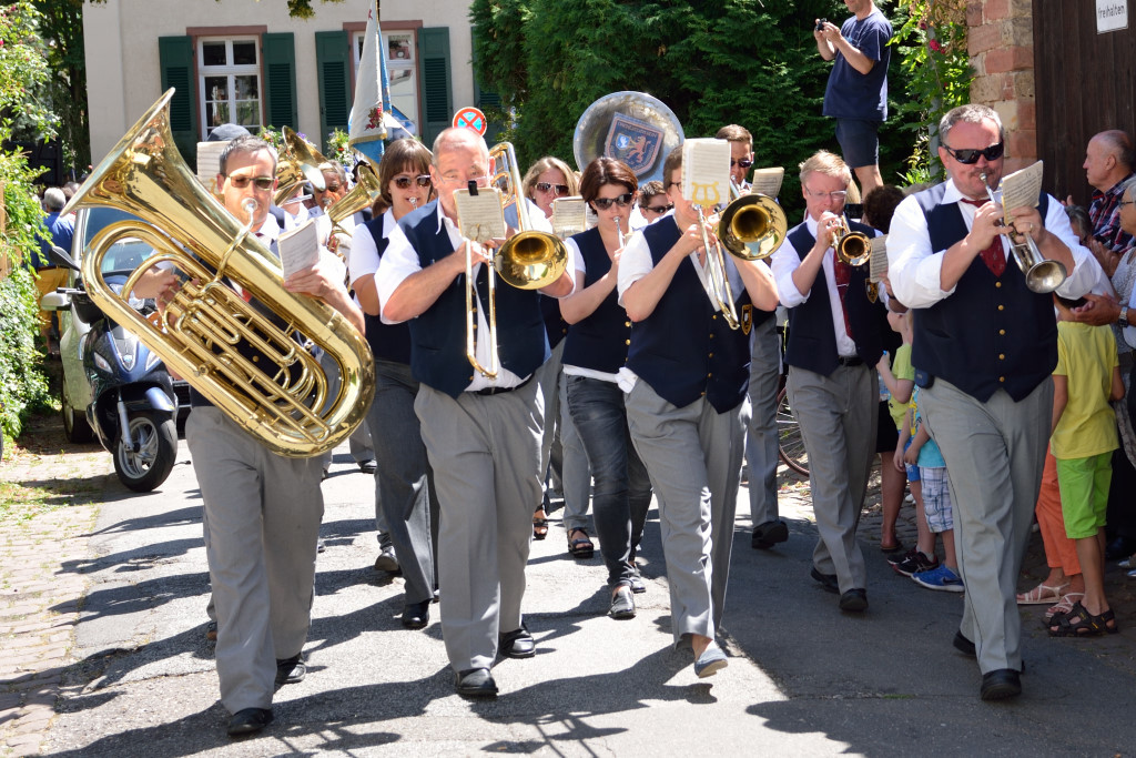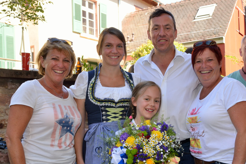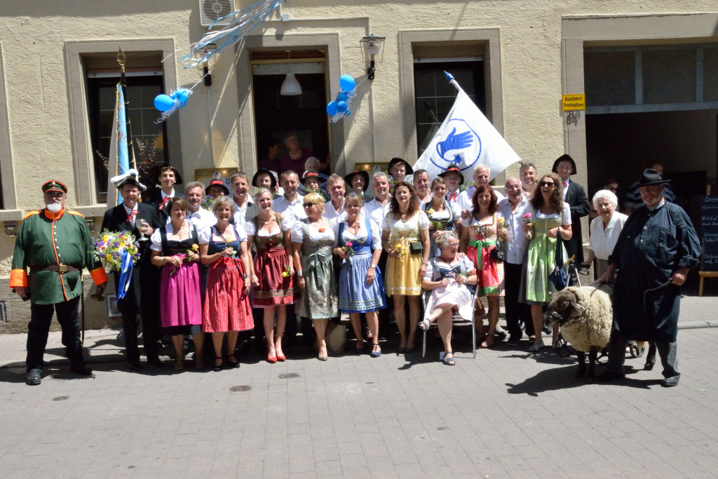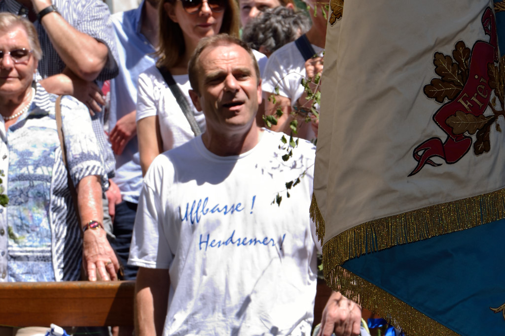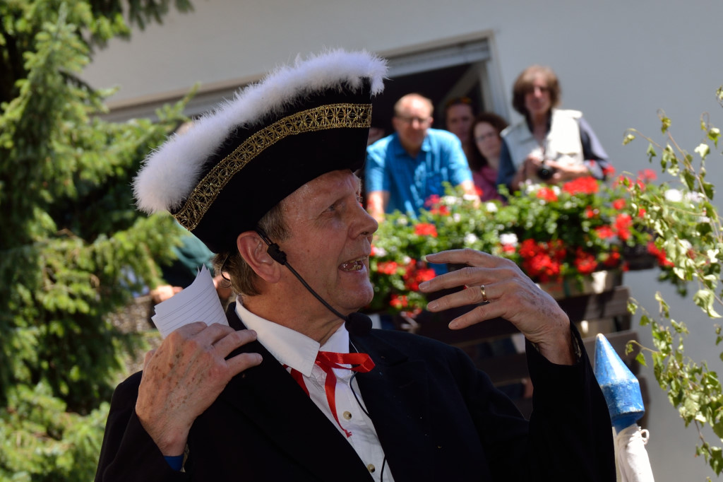 Bei bestem Kerwewetter versammelten sich am Kerwesonntag wieder zahlreiche Zuschauer am Lindenplatz. Kerweschlackel Volker Bender zeigte sich bei seinem 20. Einsatz angesichts der großen Zahl doch etwas erstaunt, denn zwei große Ankündigungsplakate für die Kerwe waren gestohlen worden; welch ein Skandal! Verdächtig seien natürlich die Neiemer und die Dossemer, aber – so schränkte er ein – bewiesen sei noch nichts..