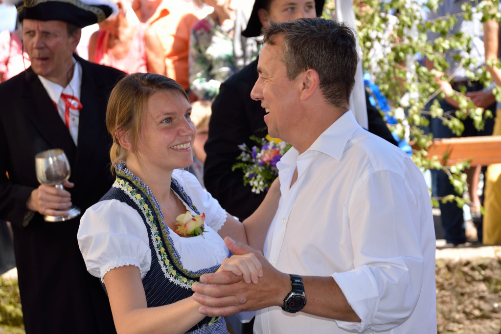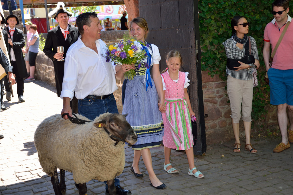 Beim Tanz um die Linde eiferten anschließend neun Paare um die Ehre, den Hammel am Anfang des Zuges in die Tiefburg führen und alle Teilnehmer bewirten zu dürfen. Die Spannung stieg immer mehr; interessant waren dabei auch die taktischen Ansätze der Tanzpaare zu beobachten: zahlreiche Piroutten vor der Weitergabe des Blumenstraußes zur Verzögerung oder ein Zwischenspurt, um den Blumenstrauß möglichst schnell wieder los zu werden, der auch Sprintstar Usain Bold zur Ehre gereicht hätte, gehörten zu den eingesetzten Mitteln. Als endlich der Böller knallte, hatten Svenja Schüler und Hans-Peter „Ille“ Ziegler den Strauß in den Händen und konnten so bei ihrem zweiten Mitwirken die Glückwünsche als „scheenstes Paar vun Hendesse“ entgegen nehmen. Hans-Peter Ziegler nutzte dabei gewissermaßen seinen Heimvorteil, denn er wohnt nur wenige Meter von der Linde entfernt.